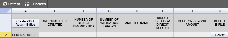 Create 990-T Return E-files Clicking this button creates the e-file and identifies if there are any reject diagnostics or validation errors. The e-file status and XML information is then displayed.