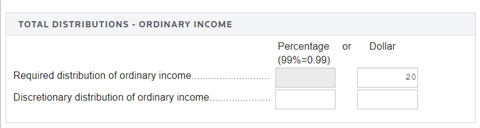 Under Organizer > Beneficiary Info (1041) > Beneficiary Data > Distribution Input – Totals, enter the totals distribution for this sub return either in a dollar amount or in a percentage, but not in both.