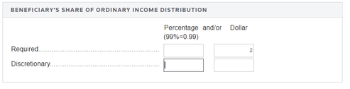 Under Organizer > Beneficiary Info (1041) > Beneficiary Data/Beneficiary Information > Individual Beneficiary Name, enter the Beneficiary’s Share of Ordinary Income distribution as a dollar amount ora percentage. Depending on which fields are used, the total of all beneficiaries’ dollar amounts must be equal to the total distribution dollar amount, or the total percentage of all beneficiaries must be 100%.