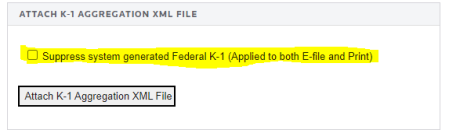 If the primary K-1 is not to be included in the XML file, check the box Suppress system generated Federal K-1 on the page.
