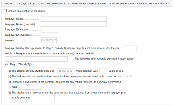 Many elections are included in the Organizer where you can choose those that are applicable to the return. These elections are included in the XML file using the General Dependency schema. For example, the IRC §72(b) election is found in Organizer > Federal Tax Elections > Predefined Elections > Code Selection 43-174(b) > Sec 72(b).