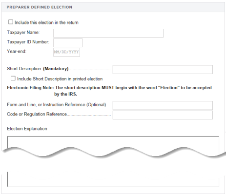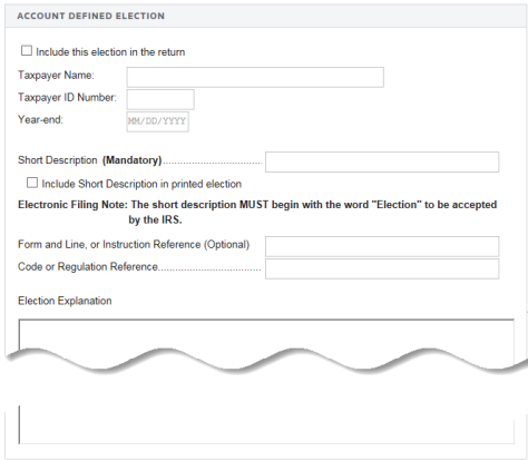 The E-file Tax Elections (Organizer > Federal Tax Elections > e-File Tax Elections > e-File Tax Elections) screens are used for entering IRS Defined Elections. These elections are included in the XML file using the specific IRS-defined schemas.