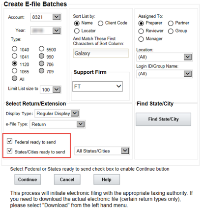 - On the Create E-file Batches screen in the Select Return/Extension section, select only the States/Cities ready to send option.
