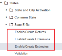 Each state and city offering e-file estimates is listed when activated in Organizer > States > State and City Activation. The state extension should be enabled within Organizer > States > State E-File > Enable/Create Estimates.