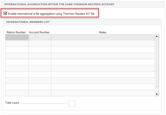 - Click the International folder, and then select Aggregation Within Same Account. On the screen, select the check box (see the box below) labeled Enable International E-file aggregation using Thomson Reuters XIT file.