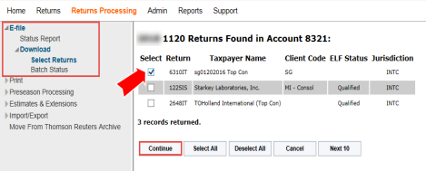 - View the progress of your download on the Batch Status screen. Select 1120 Return as the Download Type in the drop-down list, and then click Continue.