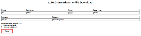 - The 1120 International E-file Download page is displayed with the Export Batch Job number and the number of returns queued. Click the Close button.