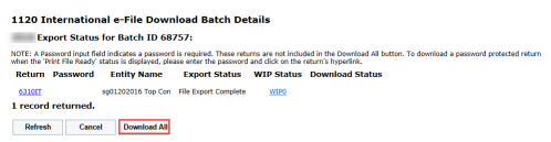 - Click the Batch ID link (blue underline) that relates to the 1120 international e-file download you initiated.