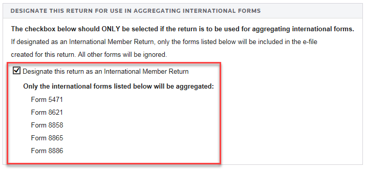 - Select Federal E-file > International Member Return. Then select the check box International Member Return (for aggregating the forms listed below).