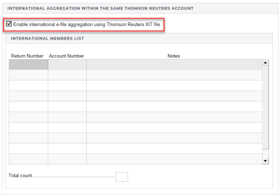 - Click the Aggregation Within the Same Account folder to open the screen. Select the Enable international e-file using Thomson Reuters XIT file check box.