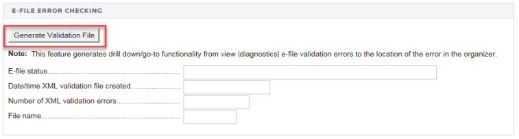 - In the Organizer, select Federal E-file > Error Checking, and then select the Generate Validation File button.