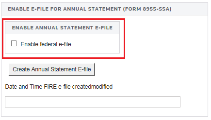 - Select the option to enable e-file for the Electronic Annual Statement (Form 8955-SSA). This is mandatory to ensure the proper updating of the electronic data. This is not required before this point in the return preparation, but it is required from this point forward.