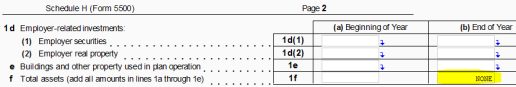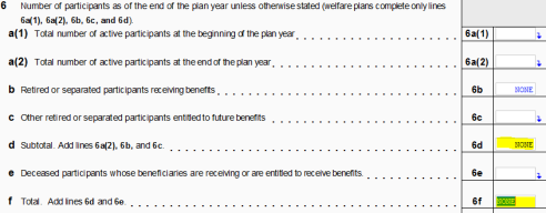 - Navigate to Tax Forms > Form 5500 > Page 2. Lines 6d and 6f should be NONE.