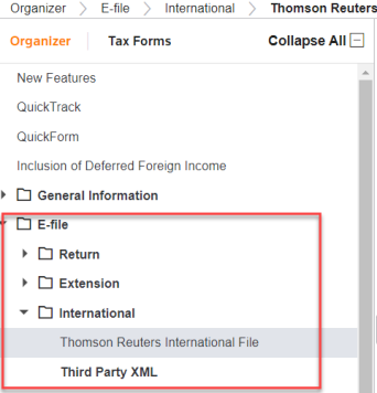 - In the Organizer, go to E-file > International > Thomson Reuters International File.