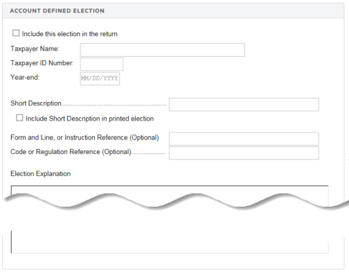 You have the ability to set up your own elections in the Tax Defaults. These elections are displayed within Organizer > Federal Tax Elections > Account Defined Elections when you open your return. You can then select those elections that might apply to this return. Modifications can be made to these elections, but Account Defined elections cannot be added within the return.