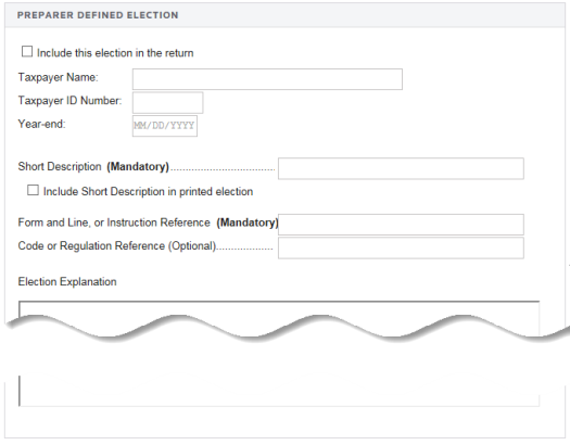 You can add your own return-specific elections using the Preparer-Defined Elections screen by entering a new Short Description. These elections are included in the XML File using the General Dependency schema.