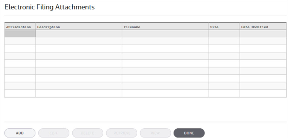 - On the Electronic Filing Attachments screen, select Add to add a new attachment.