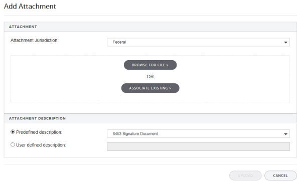 - On the Add Attachment pop-up screen, select the Attachment Jurisdiction from the drop-down list that applies to this attachment. Select Next.