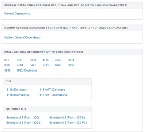 The General Dependency schema is used to include information at the return level for Forms 1120 and 1065. The General Dependency – Medium is used to include information at the return level for Forms 1120-F and 1120S. The General Dependency – Small is used at the form level of all return types for the following forms: