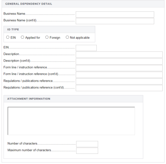 A General Dependency is used for the submission of information that is not specified in a predefined schema. For each form that allows attachment of a general dependency, the Overview screen displays links to access general dependency information. Select a link to access a specific item.