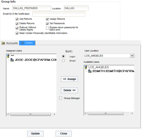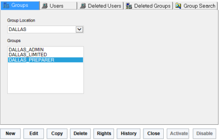 The User Location list allows selection of a specific location. The Available Users list box allows selection of users that currently are not members of the group, including users from other locations. In the example below, the user BSMITH from Los Angeles can be made a member of the DALLAS_PREPARER group. User-administrators appear with their login IDs in bold.