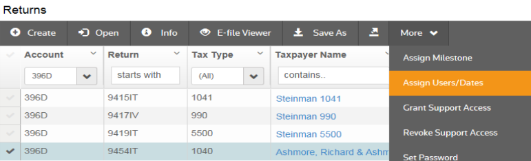 - In Returns, find a return or returns to be assigned by placing a check mark next to the return. Select More > Assign Users/Dates.