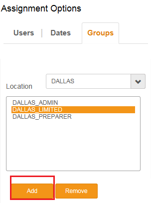 - On the right accordion Assignment Options section, select the Groups tab. Then select the DALLAS location in the Locations drop-down options.