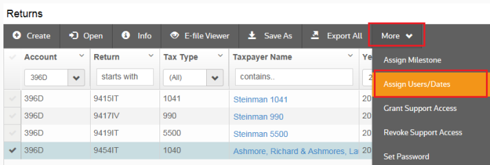 - On the Returns list page, place a check mark in the left column of the return(s) you wish to be assigned to the same user. Open More > Assign Users/Dates.