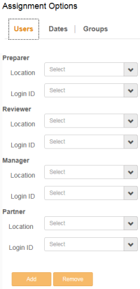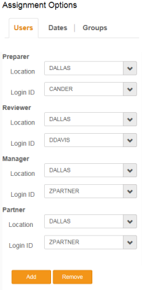 - Open the Location and Login ID for each assignment you want to make and choose the assigned user from the drop-down list. When you have finished assigning the users to the return(s), click Add.