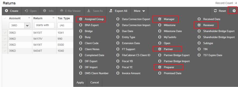 In order to see the Preparer, Reviewer, Manager, etc. on the Returns List page, you may need to open the Show/Hide Columns action item and place check marks in the detail options you want to see on the Returns List page. When you have completed your choices, click Apply.
